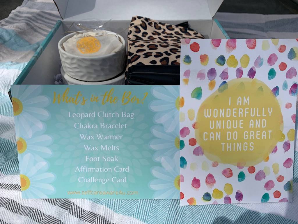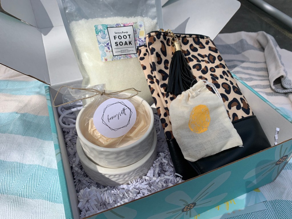 To me the color of a Robbin’s Egg gives me the feeling that flowers are blooming like the daisy’s on our box and maybe summer is around the corner! 2) A photo of our box when you first open it. 3) Animal Print Clutch Bag, its adorable and is the perfect size for your phone makeup keys and wallet. The perfect amount of space to grab and go! 4) Wax Melter, this beautiful wax melter is electric with a toggle on and off switch. Melt your favorite wax scents without a flame. 5) “honeysalt” Cape Cod is back with a soothing scented wax melt to go with your wax melter. Each wax honey comb is good for hours of reusable aroma therapy. Simply toss out the hardened wax melt once it has lost its scent and add a new one! 6) Summer Breeze foot soak. Add 3 table spoons full to a warm foot bath and soak your tired feet. Moisturize with your favorite lotion. 7) Chakra Bracelet from Made By Bella Cape Cod. Meant to reflect the energy points in your body. Breathing deeply is said to bring balance back to your mind, body and soul. Use this bracelet as a reminder to take timeout to meditate, relax, breathe, or pray.